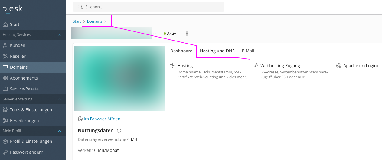 Achtung: in der neuen Plesk-Version geht es nicht mehr über FTP-Zugänge. In der aktuellen Plesk-Version muss man unter Domain » Webhosting-Zugang schauen: